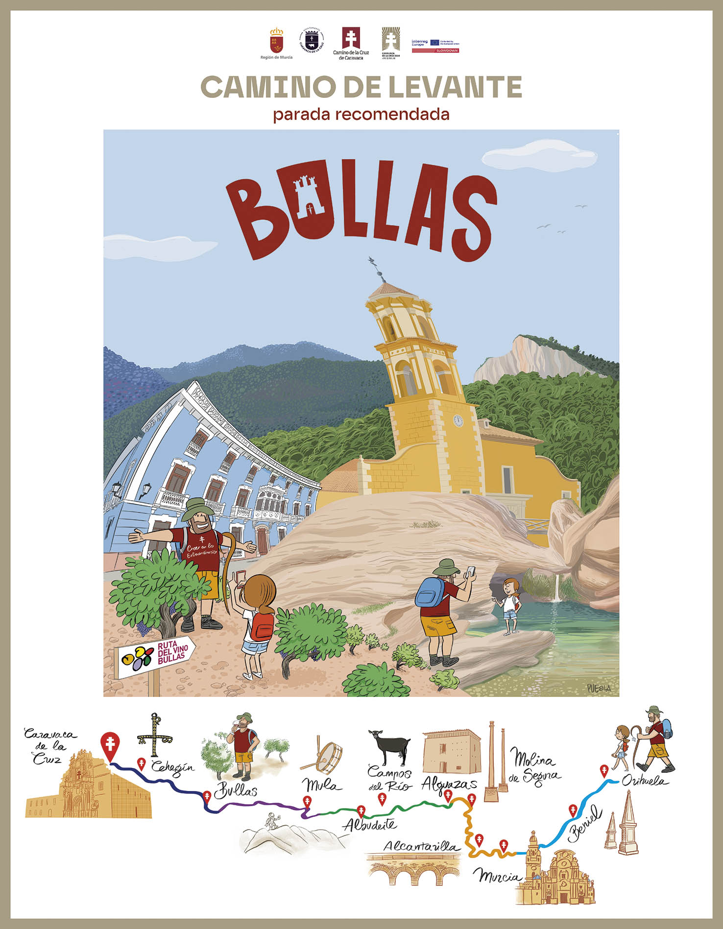 Cartel para el Municipio de Bullas anunciando los lugares recomendados para los peregrinos del Camino de Levante